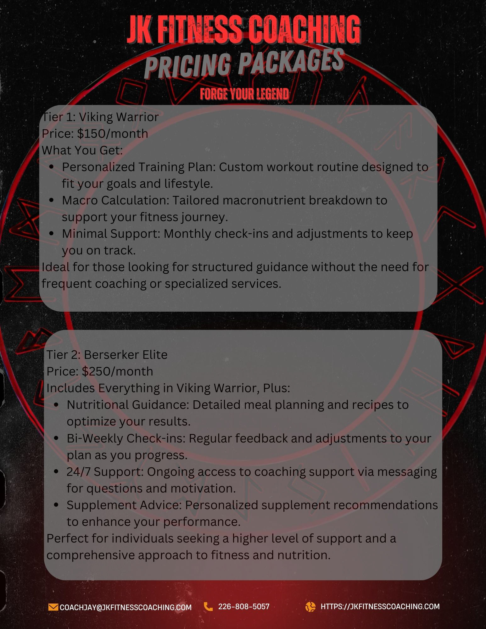 At JK Fitness Coaching, we take pride in offering a no-nonsense, results-focused approach to online training. We understand that every client is unique, which is why we design plans tailored to your body, your mindset, and your goals. Whether you’re aiming to build muscle, lose fat, increase strength, or improve overall wellness, we’re here to help you forge your legend—on your terms.